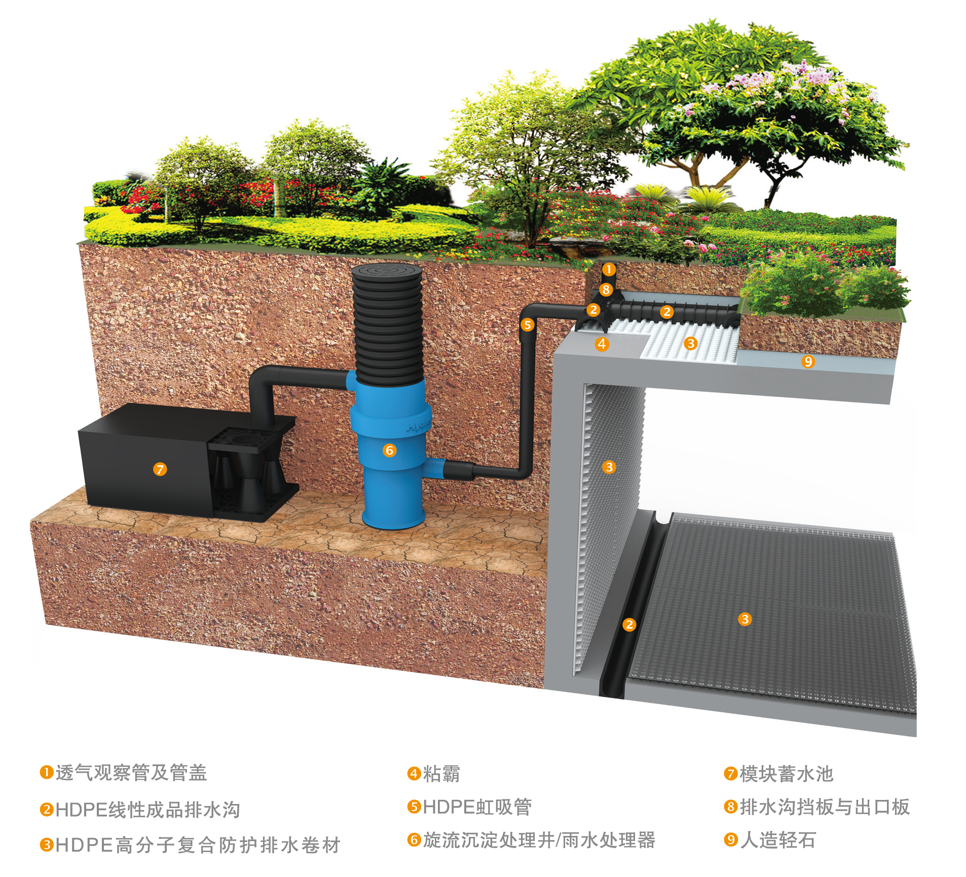 SLC种植屋面防护虹吸排水收集系统是利用HDPE排水板作为防水层的保护层,同时承接入渗的雨水;HDPE排水板上的雨水排入HDPE线性成品排水沟,通过HDPE线性成品排水沟有组织地对雨水进行汇集;最终运用虹吸排水的原理,通过HDPE虹吸排水管把汇集在HDPE线性排水沟中的雨水收集到雨水收集利用系统或排放到市政雨水管中。
