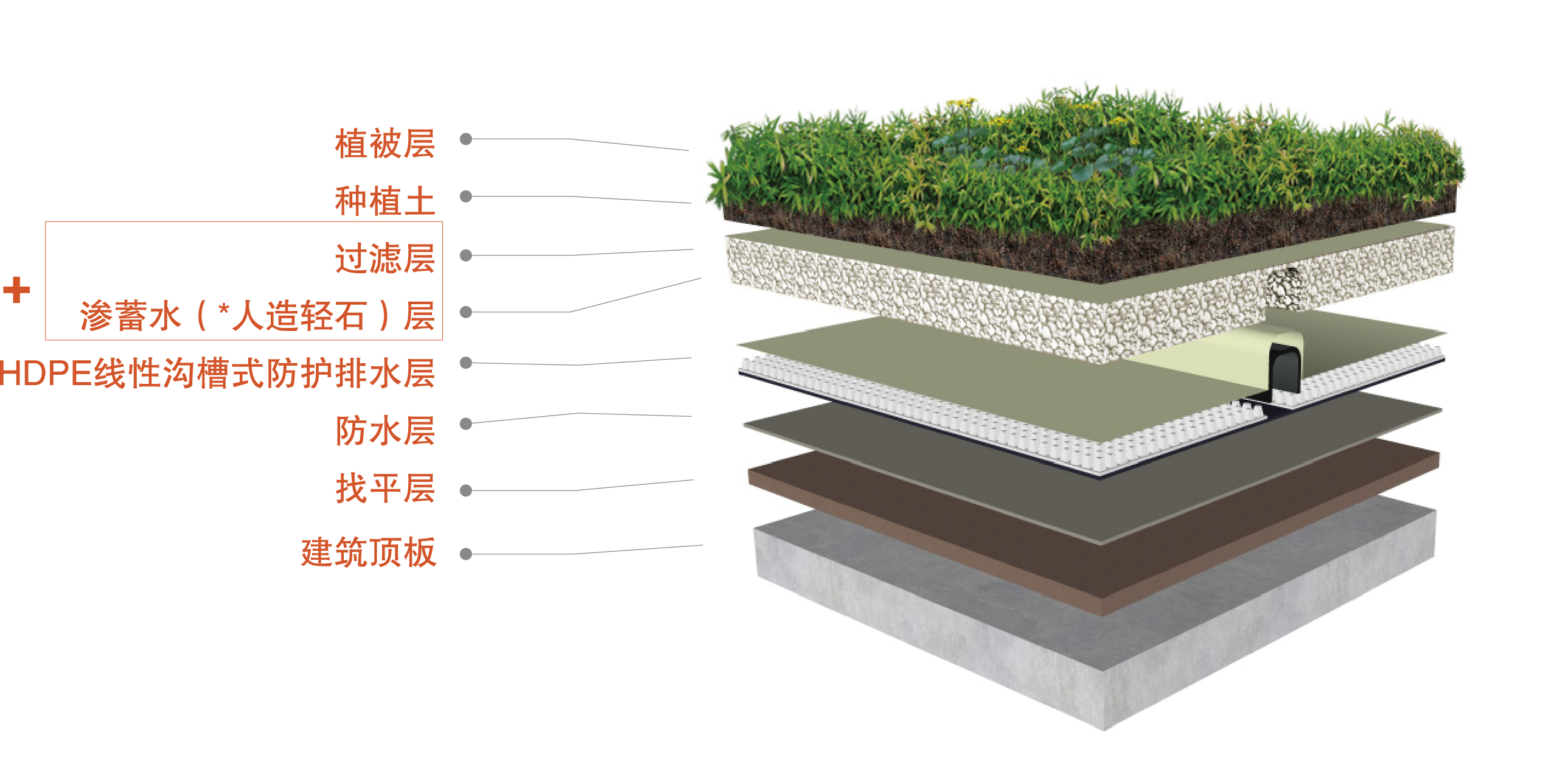 SLC+方案是利用劲驰人造轻石具有多孔、比表面积大、轻质、透气、透水、保水、隔 热、阻燃、强度高、不降解等特性。在HDPE线性沟槽式防护排水层上增加过滤层和渗蓄水层。
